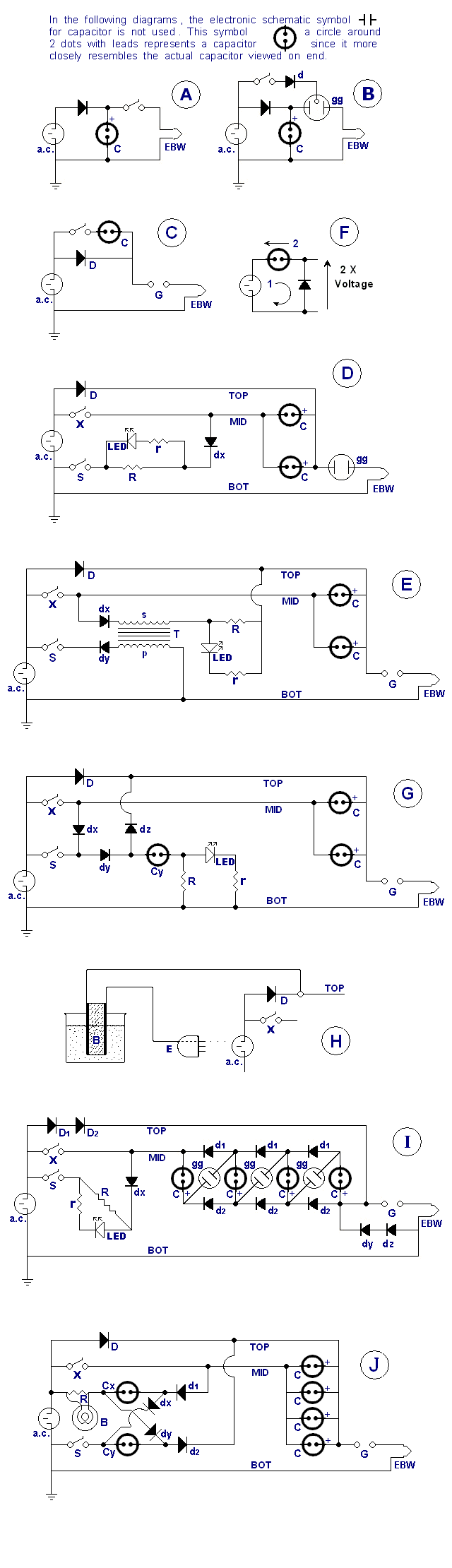 | - continued from the post above - If 2 capacitors ' C ' are placed in a circuit so that both are in series , as in the Marx layout , equivalent capacitance then becomes 750 uF , but the voltages in series add 486 + 486 , plus the a.c. power line voltage of 162 peak comes to 1134 volts at firing. By E = CV^2/ 2 , (.00075 F X 1134 X 1134 ) / 2 , = 482 Joules Drawing ' J ' - T H I S . I S . T H E . O N E . T H A T . M A T T E R S Alternatively if both capacitors are placed instead in parallel as in circuit Drawing ' J ' , the equivalent capacitance is the sum of both , 3000 uF. The firing voltage remains the same , charged to 486 volts ( 3 times peak a.c. line voltage ) plus the a.c. power line voltage boost at firing comes to 648 volts. By E = CV^2/ 2 , (.003 F X 648 X 648 ) / 2 , = 630 Joules THE LESS ELABORATE CIRCUIT OUTPUTS . 1 4 8 . JOULES MORE POWER ! Employing the higher voltage rated caps ~ 450 volts requires a voltage tripler circuit and an additional charging a.c. motor start capacitor. This is outlined in Drawing' J ' Single Pole Single Throw switch - SPST / no ( normally open ) ' S ' connects the charging circuit of a.c. motor start capacitors ' Cx , Cy ' & diodes ' dx , dy '. ( * * NOTE where the wires cross ' in between ' Cx , Cy ' there is N O connection ). Half cycle ' 1 ' charges the caps and half cycle ' 2 ' applies both voltages in series with the a.c power line voltage to diodes ' d1 , d2 ' and the firing capacitors ' C ' charging them in parallel to 3 times the a.c. voltage. Electron current flows through diode ' d1 ' into ' Mid ' conductor collecting in the negative ( - ) terminals of caps ' C ' displacing current out of the positive ( + ) terminals flowing through ' Top ' conductor and down into diode ' d2 ' ( * * NOTE where the wire crosses ' Mid ' conductor there is N O connection ). Resistance ' R ', is necessary to protect the small diodes from excessive current when charging starts. Parallel with ' R ' is an a.c. voltage rated light bulb ' B ' to provide visual indication when it momentarily flickers on then darkens indicating that charging has occurred. Firing as before is done by circuit breaker ' X ' with switch ' S ' turned off F I R S T before the charged circuit can be fired. Circuit breaker ' X ' fires the circuit by applying the a.c. line voltage in series with the cap(s) , which arcs into conduction the Spark Gap ' G ' near the peak of the a.c. sine wave. ' Top ' conductor channels the resulting current surge left and down shunt diode ' D ' to the a.c. source. I want to emphasize that it is possible to achieve equally high energy and power surge levels using fewer components than for the Marx generator mentioned above. Compared to the 1891 Joule Marx generator of 10 - 1500 uF caps , just 6 of these caps in parallel as in Drawing ' J ' would be 9000 uF , then By E = CV^2/ 2 , 1890 Joules = (.009 F X 648 X 648 ) / 2 EQUIVALENT OUTPUT OF JOULES USING FEWER COMPONENTS ! The circuit performance is improved by eliminating the extra resistance that is present with the extra components and wiring. By having a bank of capacitors in parallel , just as with resistors in parallel , equivalent resistance is greatly diminished , ( the exact opposite of series resistance! ). http://www.electronics-tutorials.ws/resistor/res_4.html http://www.electronics-tutorials.ws/capacitor/cap_6.html http://www.electronics-tutorials.ws/capacitor/cap_7.html The same as with batteries , for capacitors in series the voltages add , for capacitors in parallel the currents add. The RC time constant remains unchanged for either configuration because the ESR of individual caps does not change. TC = R X C = ( 0.1 X .0015 F ) = .00015 sec - | - For six 1500 uF caps in series the errected capacitance is ( 1500 / 6 ) = 250 uF, the ESR value of each adds so that 6 X 0.1 ohm = 0.6 ohm , TC = R X C = ( 0.6 X .00025 F ) = .00015 sec. - | - For six 1500 uF caps in parallel capacitance adds totaling ( 1500 X 6 ) = 9000 uF, equivalent ESR of the bank reduces to ( 0.1 ohm / 6 ) = .0167 ohm , TC = ( .0167 X .009 F ) = .00015 sec. also By graphing power relative to time as it appears on an oscilloscope, energy is represented by the area under the power trace. Capacitor ESR establishes how brief the RC time constant is and how narrow the pulse. By varying the voltage , the only thing that can be altered is the leading slope of the pulse ( and the height ) not its width ( the area remains constant because the energy is the same ) Very short pulse durations are only acheived by capacitors having exceptionally low ESR. As these do not have large capacitance, they must have a very high voltage to store significant energy.The increased resistance of the series circuit depletes more power and is less efficient. More importantly with lower voltage one can dispense with heavy high voltage insulation requirements to obviate systemic breakdown ( arcing ) which occurs at kilovolt levels. At kilovolts everything is huge http://www.celnav.de/hv/hv1.htm Of course lower voltage produces comparatively longer current rise time ( all things being equal ) but it won't matter given the following current surge. The rated energy per cap at 450 volts is 150 Joules times ten caps is 1500 Joules. By slightly overcharging to 486 volts plus the boost from a.c. line voltage applied in series during it's discharge , output is increased to 3149 Joules = (.015 F X 648 X 648 ) / 2 slightly more than the 165 pound 240 uF high voltage capacitor mentioned at the beginning of this post. Yet this device is small enough to fit into a shoe box and weigh less than a 3 liter bottle of soda. How to size a capacitor bank , specific for ultracapacitors but generally applicable. http://www.powerdesignindia.co.in/STATIC/PDF/200807/PDIOL_2008JUL31... See attachment below - Equivalent Series Resistance & Maximum Leakage.rtf - One can determine all the values for one capacitor and then simply - - multiply by the number of caps to obtain the output of 